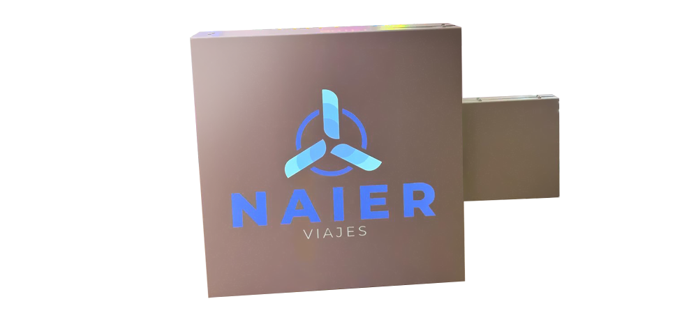 El logotipo o texto se cala directamente en el frontal, permitiendo que la luz LED blanca, cálida o RGB se proyecte desde el interior a través del metacrilato, creando un efecto visual llamativo y profesional.