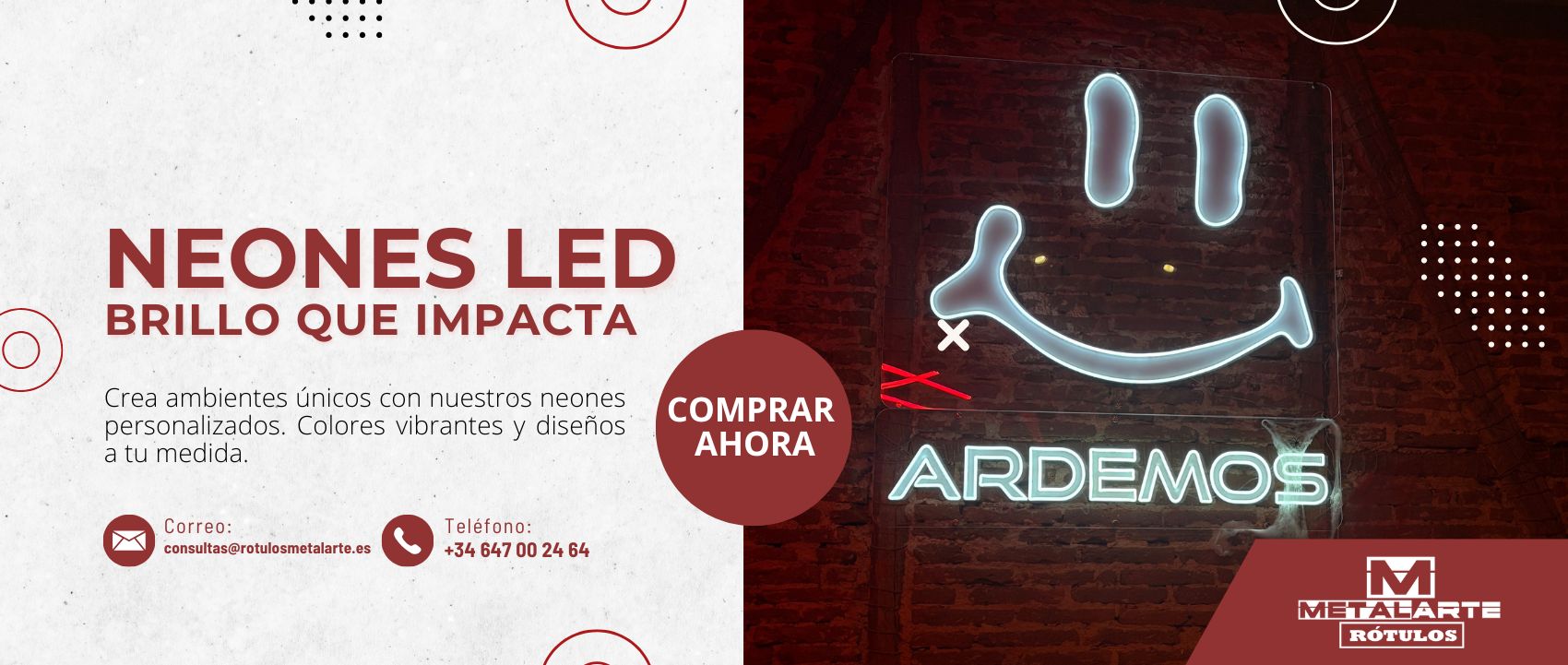 En Rótulos Metalarte, somos apasionados de la rotulación publicitaria y contamos con más de 10 años de experiencia en el diseño y fabricación de rótulos personalizados. Nuestro equipo de profesionales se especializa en crear soluciones únicas, como rótulos publicitarios, neón LED flexible, vinilos adhesivos, impresión de rígidos, corte láser de precisión, adaptadas a las necesidades de cada cliente.